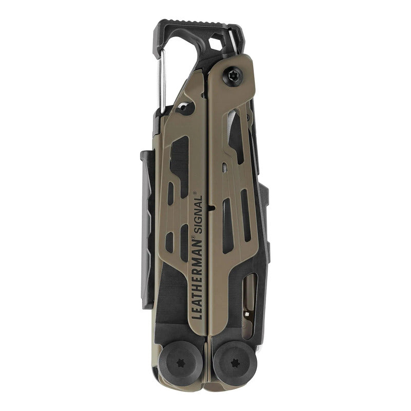 Un ajuste perfecto para cualquier aventura, el Signal® combina 19 herramientas útiles en un tamaño compacto de 4.5 pulgadas. Esta herramienta múltiple lo prepara para lo inesperado con su varilla de ferro de encendido, la cuchilla combinada 420HC y el silbato de emergencia. Apriete el equipo con el destornillador de brocas personalizable y ancle las estacas de su tienda con el martillo incorporado. Prepárese y vaya más allá con Leatherman Signal®. Recubrimiento DLC sobre acero inoxidable y negro. Cerakote ™ para colores coyote bronceado, aguamarina, carmesí, gris y cobalto. Incluye funda de nilón. HERRAMIENTAS INCLUIDAS 01 Pinzas de punta de aguja 02 Alicates regulares 03 Cortadores de alambre reemplazables de primera calidad 04 Cortadores de alambre duro reemplazables de primera calidad 05 Pelacables 06 Cuchillo combinado 420HC 07 Vio 08 Martillo 09 Punzón con bucle de hilo 10 Abrelatas 11 Abrebotellas 12 Impulsor de broca hexagonal de 1/4 " 13 Controlador de bits 14 Llave de caja de 1/4 " 15 Mosquetón 16 Llave de caja de 3/16 " 17 Silbato de seguridad 18 Varilla de ferrocerio 19 Sacapuntas recubierto de diamante ESPECIFICACIONES LONGITUD CERRADA : 4.5 in | 11,43 cm LONGITUD ABIERTA : 6.75 in | 17,14 cm LONGITUD DE LA HOJA : 2,73 pulgadas | 6,93 cm PESO : 7.5 oz | 212,6 g ANCHO : 1.5 in | 3,8 cm ESPESOR GENERAL : .63 in | 1,6 cm INCLUYE: Silbato de seguridad, varilla de ferrocerio, afilador de diamantes MATERIALES: Acero inoxidable 420HC, revestimiento DLC, Cerakote ™ BITS INCLUIDOS: Destornillador Phillips n.o 1-2 y 3/16 " Enviamos Todo los dias Tienda Especialista del Rubro